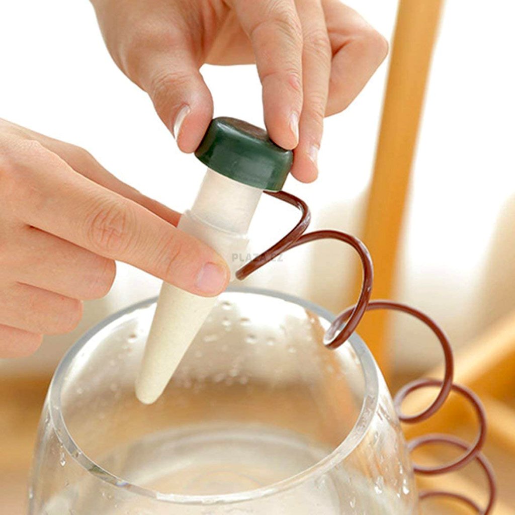 Do hrotu nalijete vodu, zašroubujete víkem s hadičkou a hrot píchnete do květináče. Pro větší květináče doporučujeme zapíchnout 2 ks. Rostliny si pak berou vodu z nádobky podle toho, jak samy potřebují. Díky automatické závlaze se vlhkost půdy udržuje na optimální úrovni, a to vše bez použití nějakého zdroje energie.